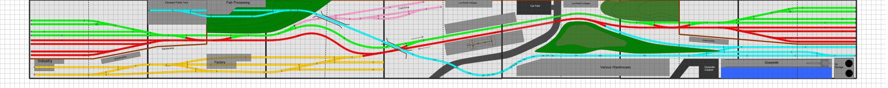 Layout A : A quayside with fiddle yards at either end. An elevated fish processing plant at the left hand end, 3" above baseboard level. A 2 platform station in the centre towards the rear of the viewing space. A quay at the right hand end at the front with goods lines to accept fish and other delivered freight. A factory/industry at the front left hand side with associated goods yard.
