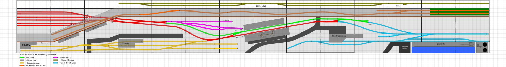 Layout A : A quayside with fiddle yards at either end. An elevated fish processing plant at the left hand end, 3" above baseboard level. A 2 platform station in the centre towards the rear of the viewing space. A quay at the right hand end at the front with goods lines to accept fish and other delivered freight. A factory/industry at the front left hand side with associated goods yard.